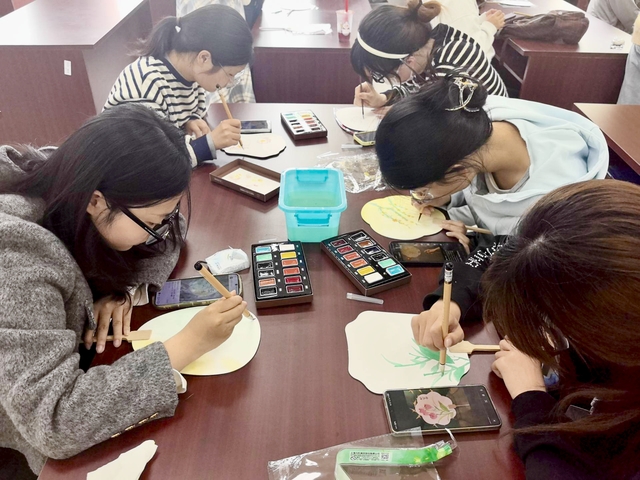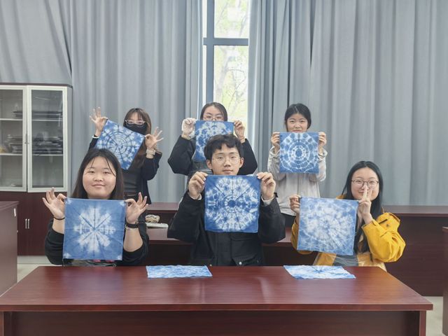 活动以扇画、漆扇、蓝印花布为载体,打造沉浸式传统工艺创作场景。现场妙趣横生、色彩流动。学生坐在桌前,指尖轻触,纹样渐成,欢声笑语与清雅古韵交织,让整个教室都浸润在传统工艺的魅力里。学生在实践中感受匠心魅力,深化对中华传统文化的理解。